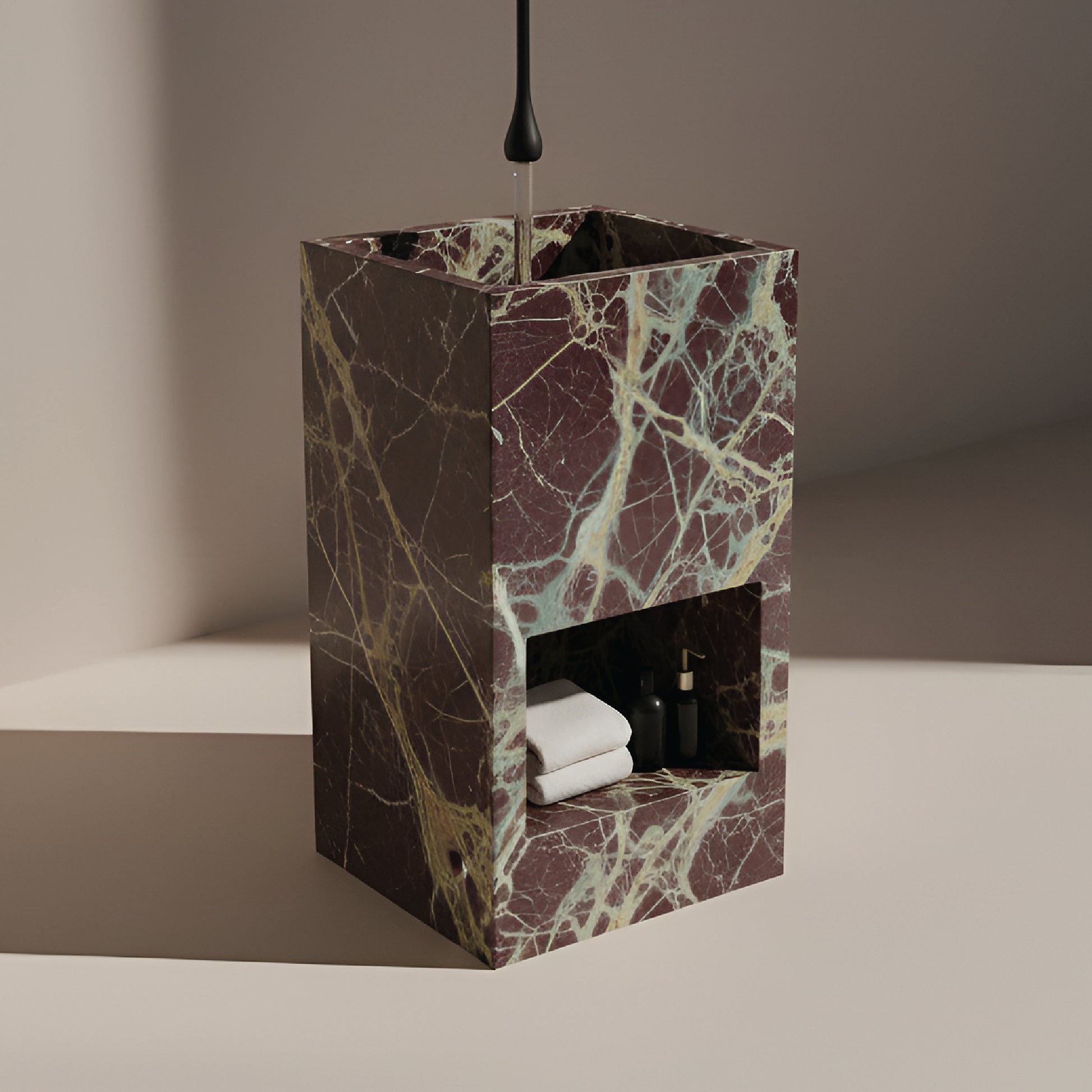 Una pieza escultórica elaborada en Cuarcita Granada, una piedra natural de tonos rojizos intensos y vetas pronunciadas que aportan un carácter único y audaz. El diseño incorpora un nicho frontal tallado con precisión, combinando funcionalidad y presencia arquitectónica.DISEÑO CON CARÁCTER