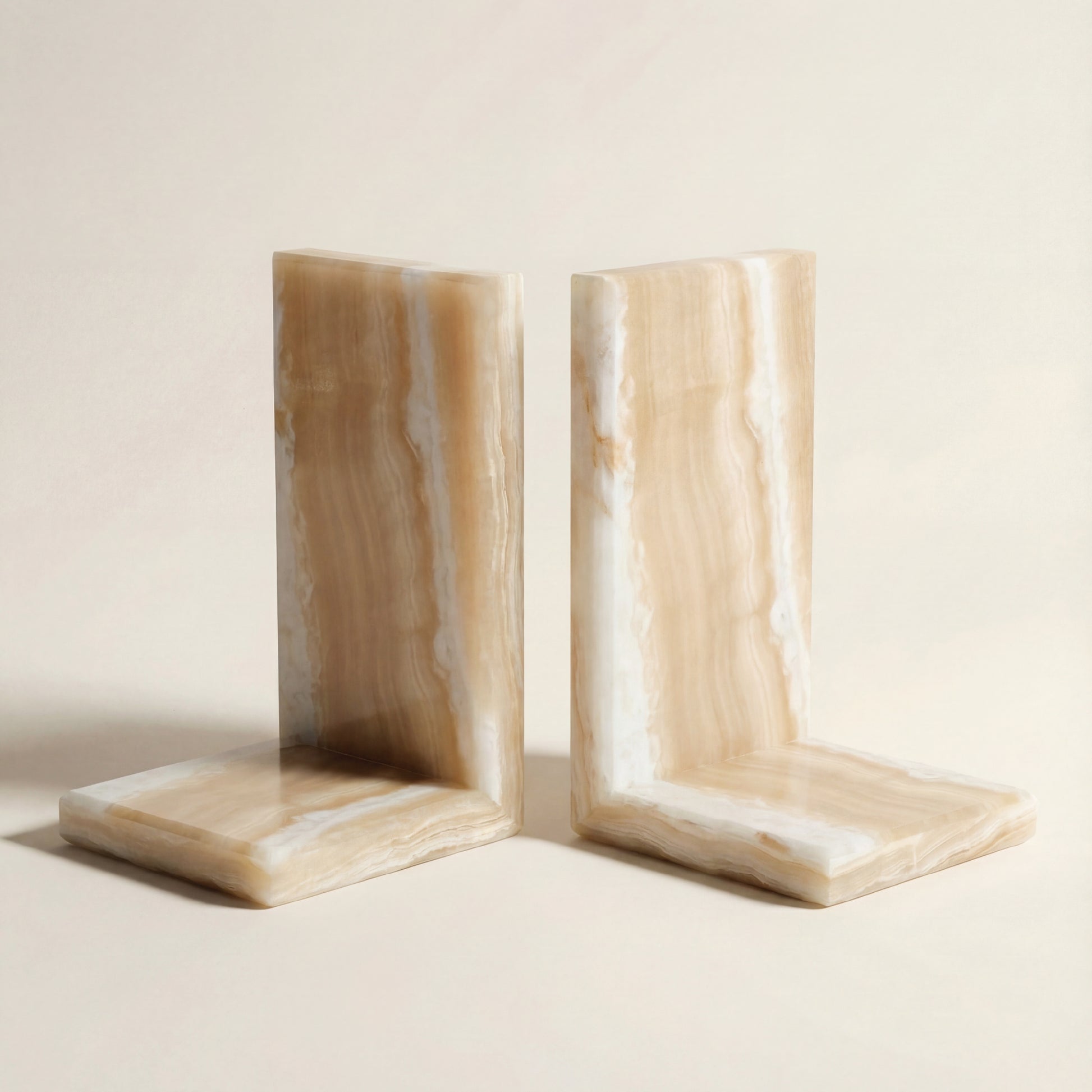 Set de 2 sujetalibros elaborados en ónix natural. Cada pieza presenta vetas y matices únicos propios de la piedra natural.