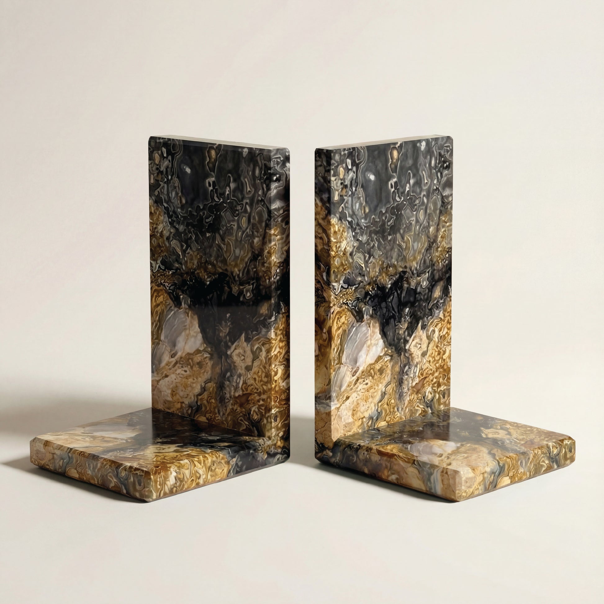 Set de 2 sujetalibros elaborados en ónix natural. Cada pieza presenta vetas y matices únicos propios de la piedra natural.